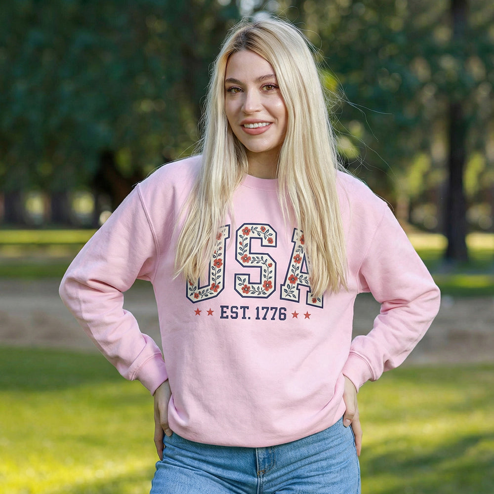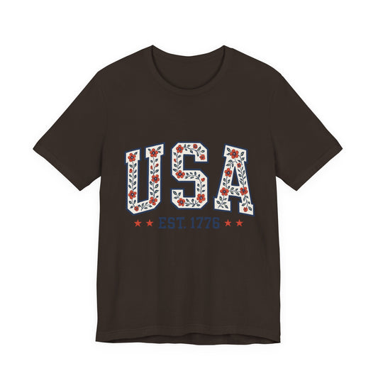 Floral USA Graphic Tee, Patriotic T-Shirt, American Pride Shirt, Casual Wear, Fourth of July Outfit, Gift for Her/Him